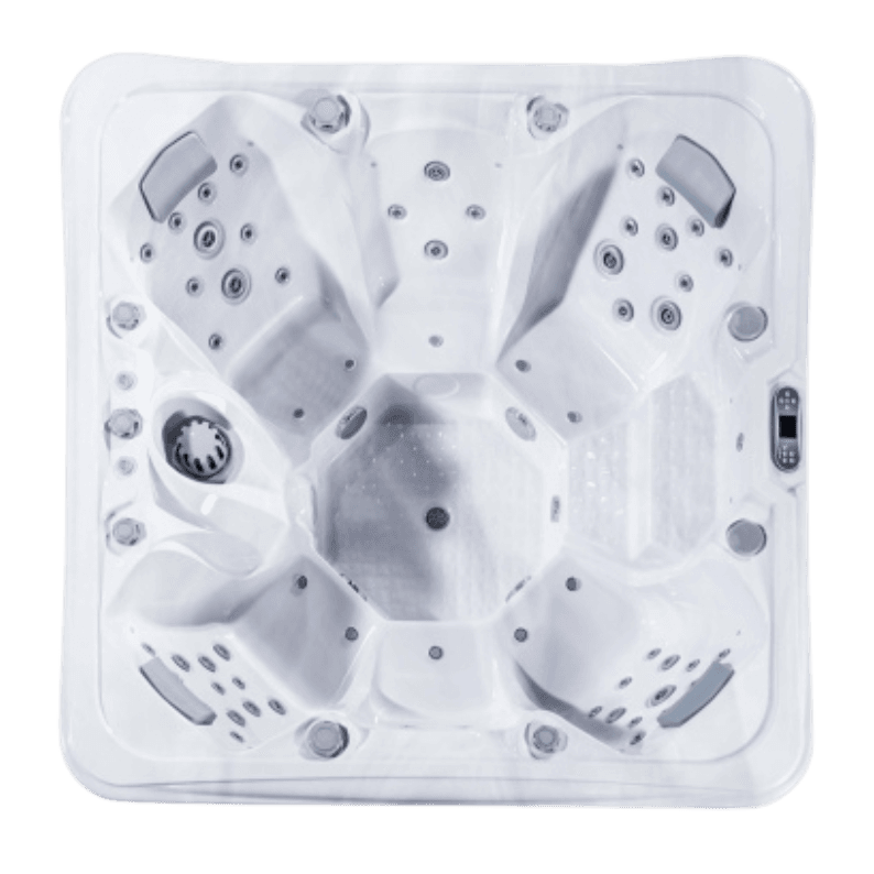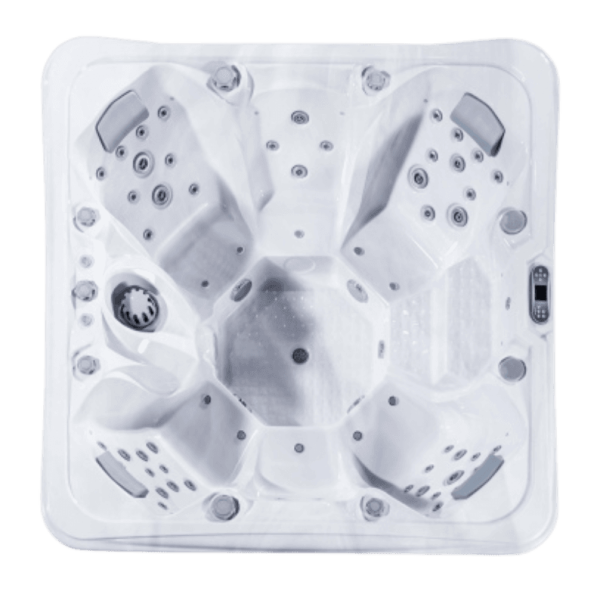 The AegeaTwo hot tub is a sleek and efficient spa engineered for relaxation and performance. With dimensions of 2200mm x 2200mm x 880mm, a weight of 390kg, and a water capacity of 1100 litres, it accommodates six users in upright seating. Its 56-jet layout includes a range of jet types—1 x 4″, 12 rotational jets, 7 directional jets, and 36 1″ jets—designed to deliver targeted hydromassage across the body. Three integrated fountains add visual and sensory appeal, while the USA Aristech Acrylic shell ensures durability and a refined appearance.