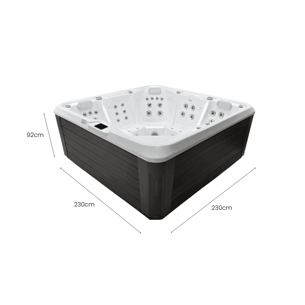 The Cayman is a deluxe large family hot tub designed for ultimate comfort and relaxation, featuring two ergonomic loungers and an advanced hydrotherapy system. Measuring 2300mm x 2300mm x 920mm, it offers ample space for multiple users to enjoy a luxurious spa experience. With 45 hydro jets and 10 air massage jets powered by dual LX-LP300 massage pumps and an LX-WTC50 circulation pump, this hot tub provides an invigorating and therapeutic water massage. The TP10-3kW intelligent control systemv ensures smooth operation, while the Spatech CA300 touch-screen interface offers an intuitive user experience.